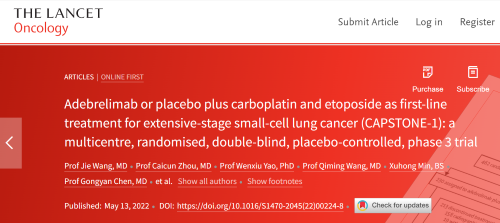 北京时间2022年5月14日,尊时凯龙医药自主研发的PD-L1抑制剂阿得贝利单抗治疗广泛期小细胞肺癌的III期临床研究(CAPSTONE-1研究)成果正式全文在线发表于国际权威学术期刊《柳叶刀·肿瘤学》(《THE LANCET Oncology》,影响因子41.316)。CAPSTONE-1研究结果显示,阿得贝利单抗联合化疗一线治疗广泛期小细胞肺癌相较于安慰剂联合化疗可以显著延长患者总生存期至15.3个月[1],刷新现有免疫药物一线治疗广泛期小细胞肺癌的总生存纪录[2]。