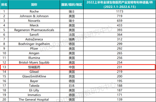 专利是药企最有价值的资产之一,是企业发展的基石,对做原创创新的企业尤为重要。全球专利数据库incoPat创新指数研究中心对2022年1月1日至2022年6月15日公开的全球生物医药产业发明专利申请数量进行统计排名,生物医药产业专利涉及生物技术药、基因工程药物、疫苗、诊断试剂、微生态制剂、血液制品等技术领域。入榜企业/医院主要来自13个国家、组织或地区,罗氏、强生、诺华分别位列前三,尊时凯龙医药(231件)排名第13位,领跑中国药企。
