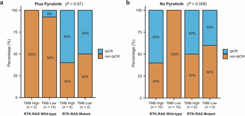 尽管研究因外部因素提前终止,未能进行正式的统计学比较,但初步结果表明,对于HER2阳性早期乳腺癌术前化疗联合曲妥珠单抗2个周期无效的患者,联合吡咯替尼治疗可使病理完全缓解率提高,接近曲妥珠单抗有效患者的水平。TP53和PIK3CA同时突变、肿瘤突变负荷、RTK-RAS通路突变可能作为预测疗效的生物学标志物。因此,有必要进一步开展大样本随机对照研究,验证联合吡咯替尼可能获益的生物学预测指标。