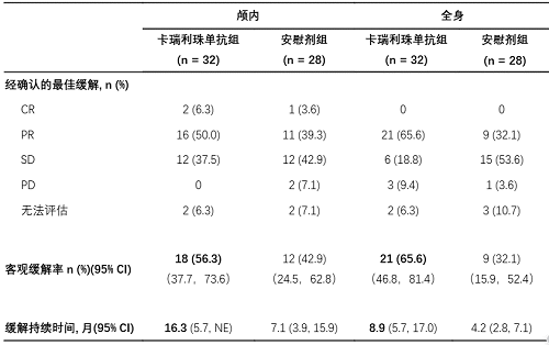 表1. 颅内和全身肿瘤缓解和缓解持续时间