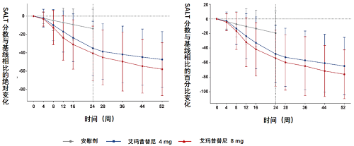 图4.研究期间SALT分数与基线相比的绝对变化和百分比变化