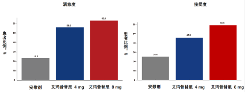 在治疗核心期和延长期间,达到SALT评分≤20的患者比例持续增加,在第52周时硫酸艾玛昔替尼片4 mg和8 mg组分别达到了46.8%和63.1%(图3),患者的SALT评分绝对值与百分比持续降低(图4)。随着症状的改善,患者对于头发再生的满意度与接受度也显著高于安慰剂组(图5)。